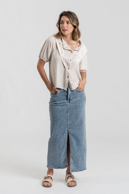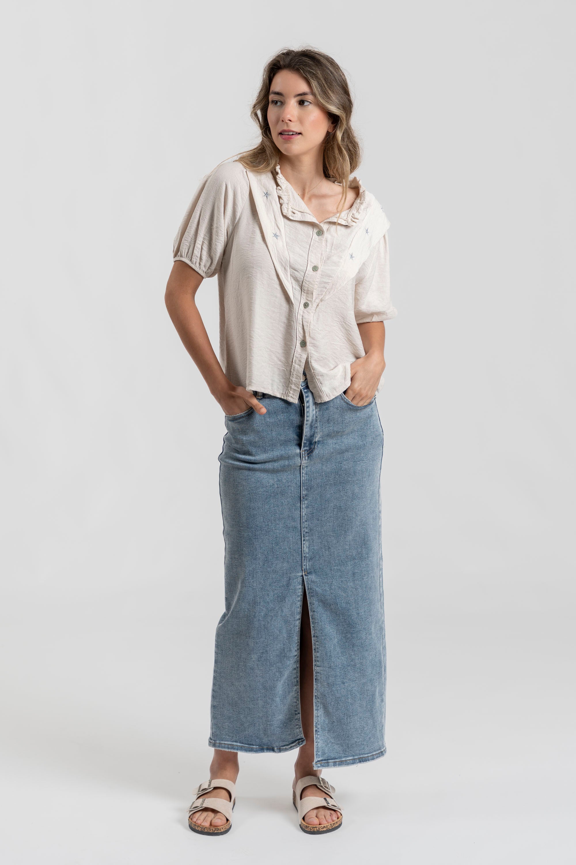 Tejido fluido. Diseño recto. Cuello redondo. Manga corta. Cierre de botones.