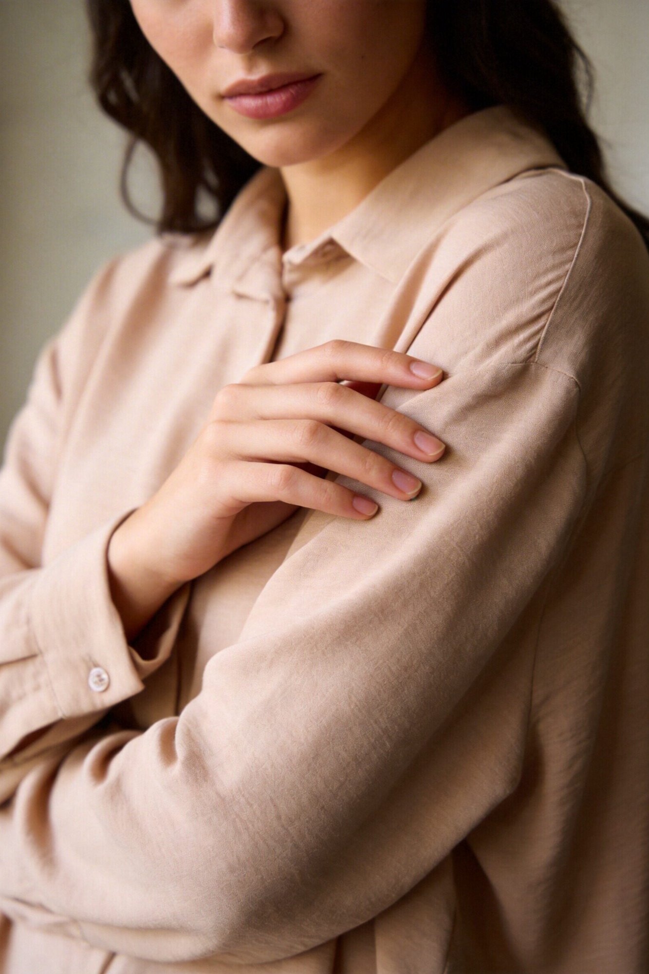 Tejido fluido. Cuello solapa. Manga larga. Cierre con botones. Altura modelo 180 cm. Talla S.