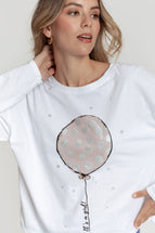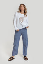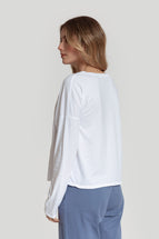 Camiseta mezcla de algodón. Diseño estampado. Diseño recto. Cuello redondo. Manga larga. Talla modelo: S. Altura modelo: 1,65 m.
