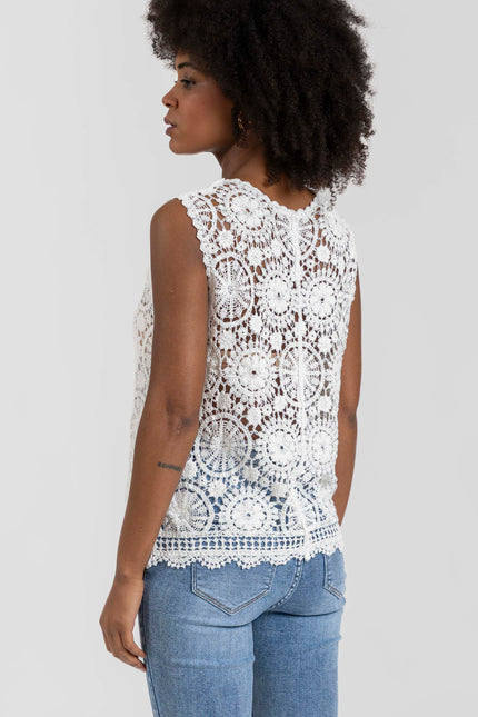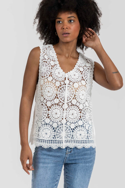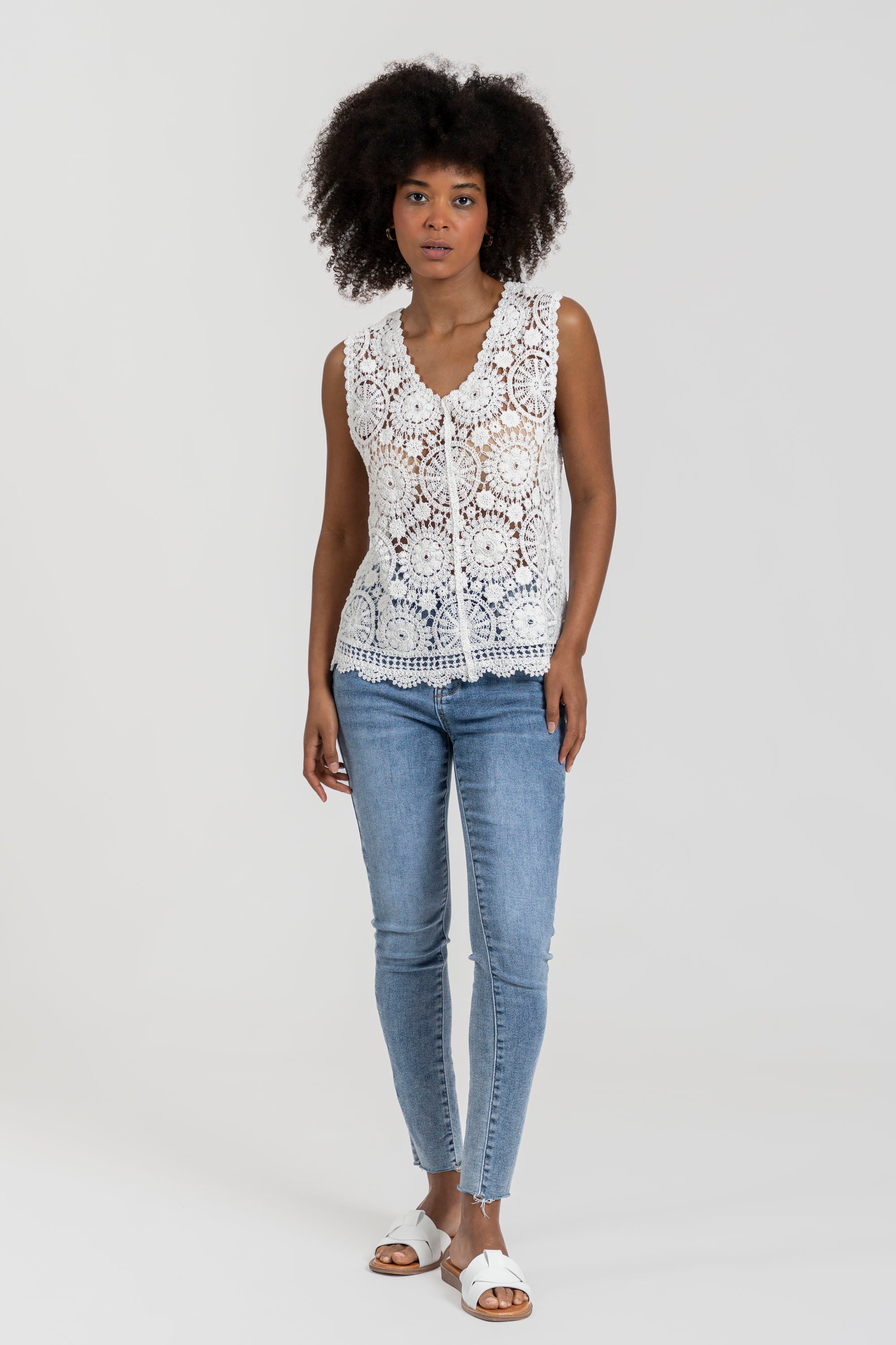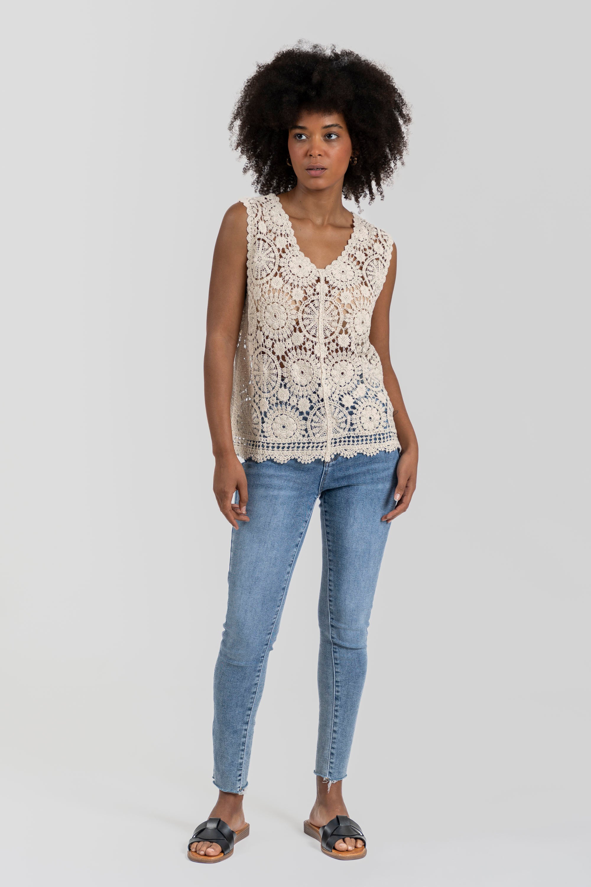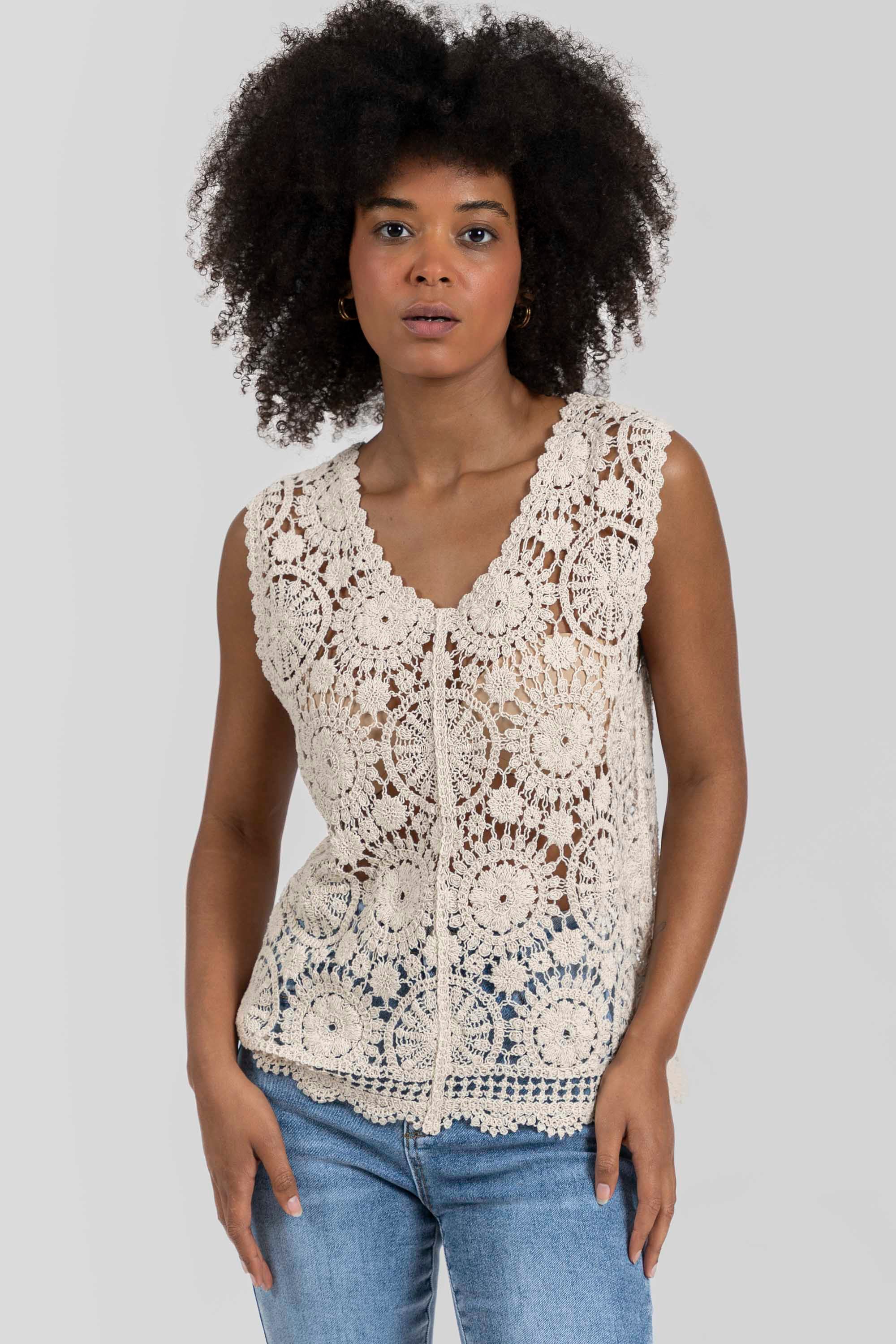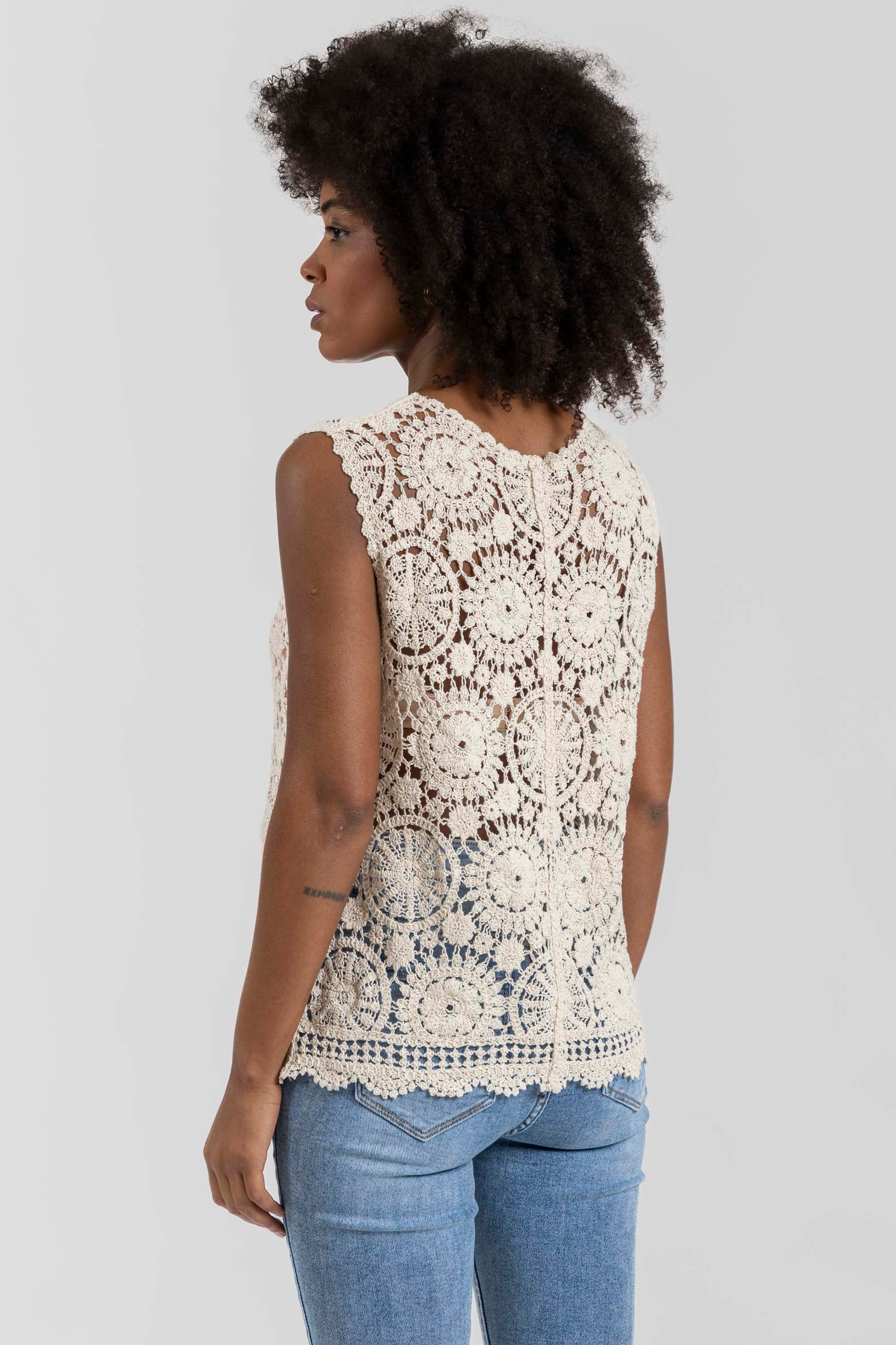 Tejido de algodón. Tejido de crochet. Diseño recto. Diseño calado. Manga sisa. Sin cierre. Bajo asimétrico. Talla M/L. Altura modelo: 1,66 m.