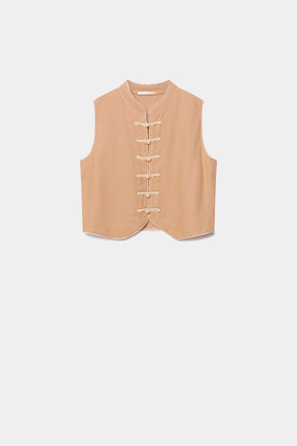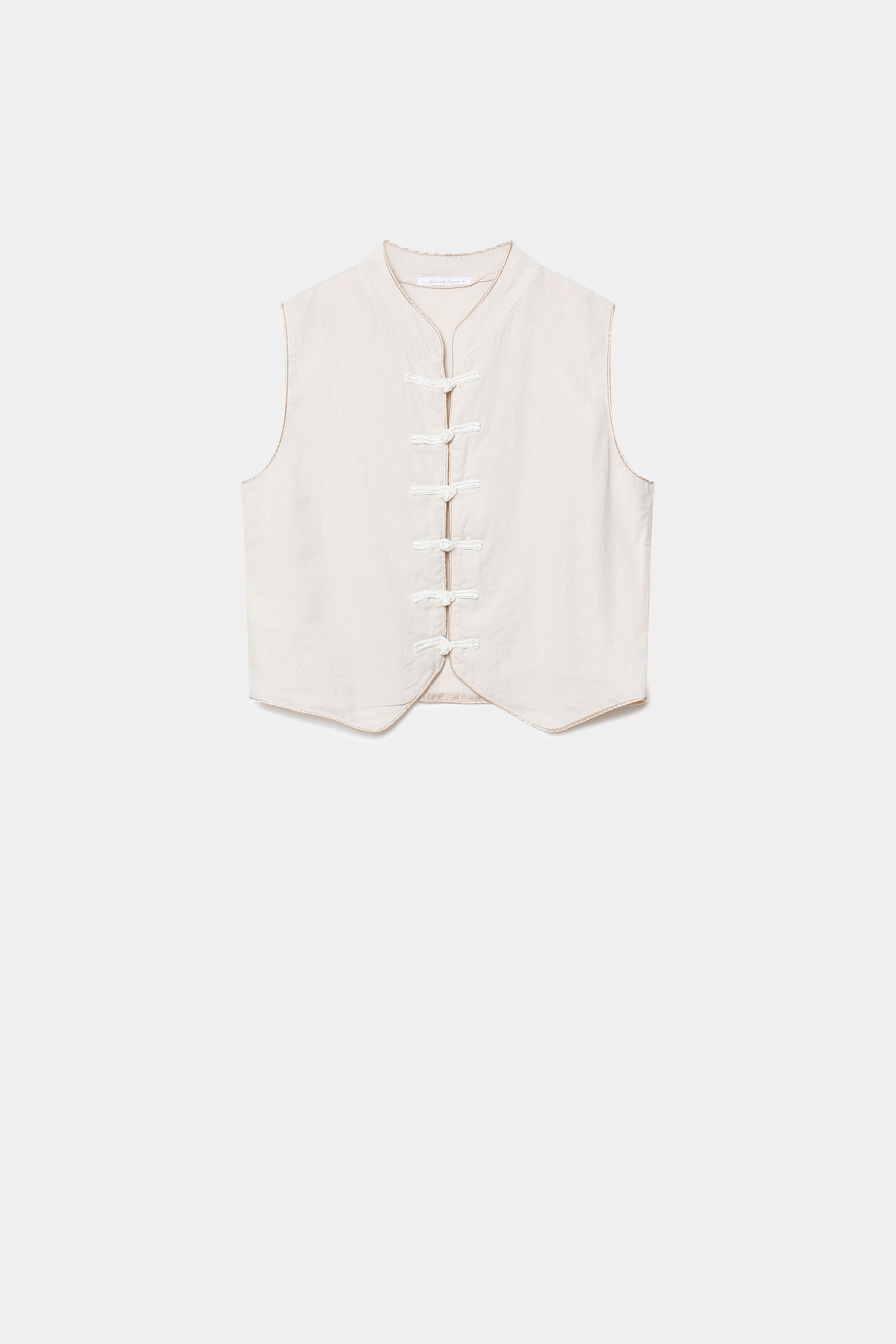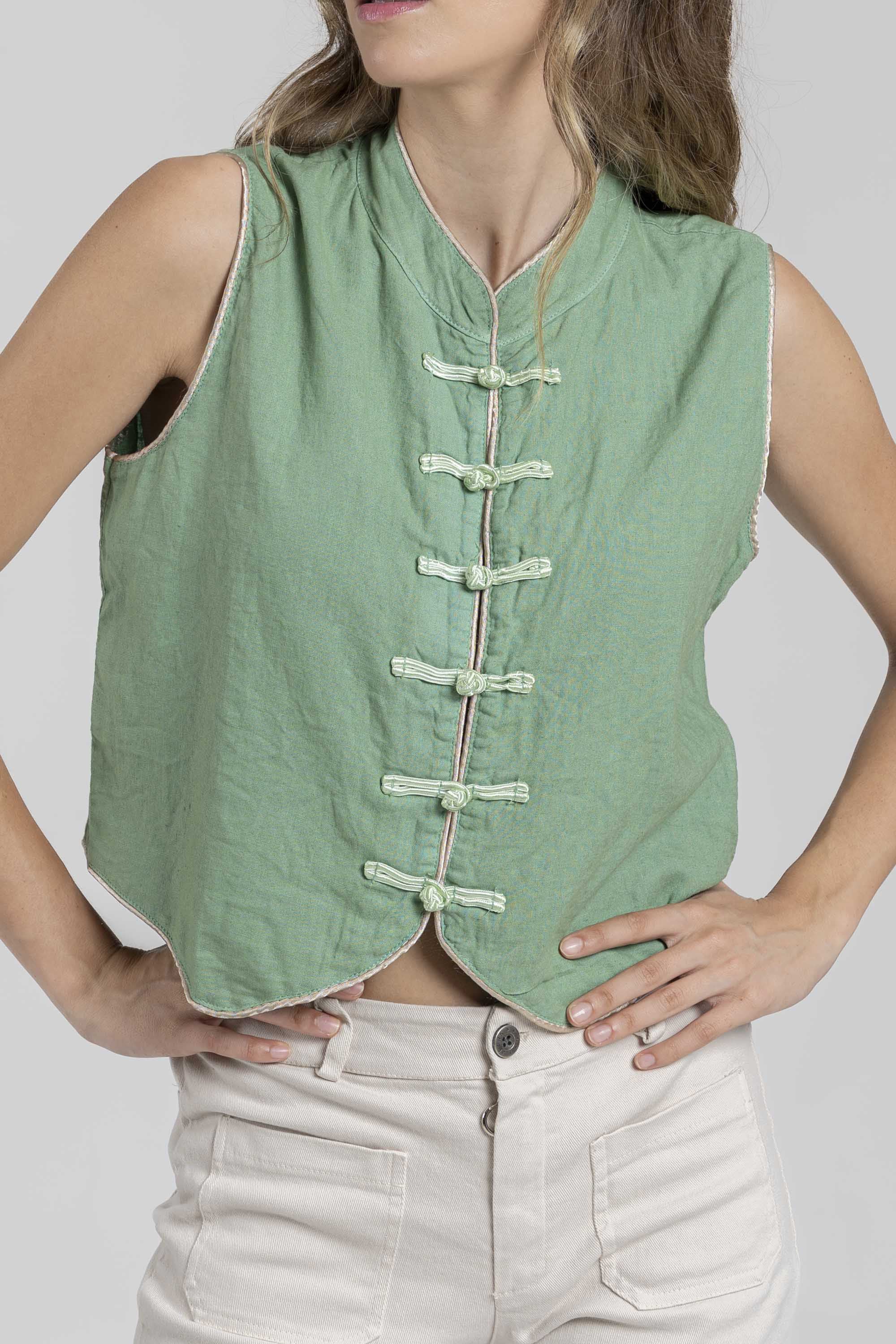 Tejido mezcla lino. Manga sisa. Cierre botones. Talla S. Altura modelo: 1.70 m