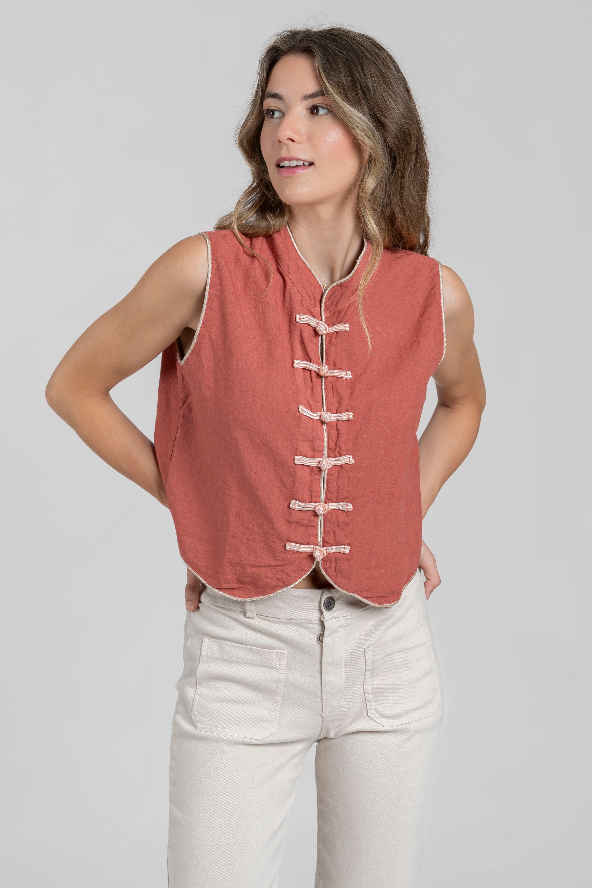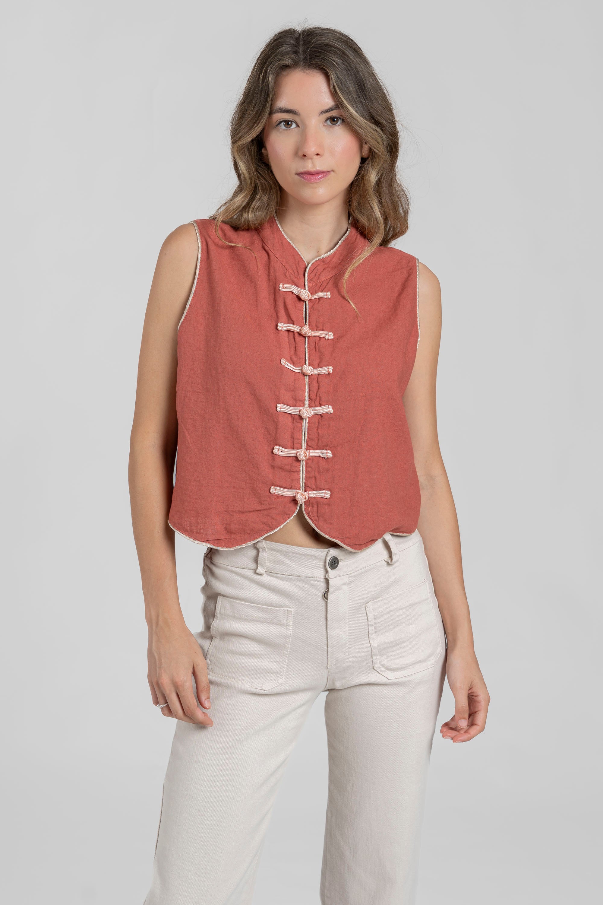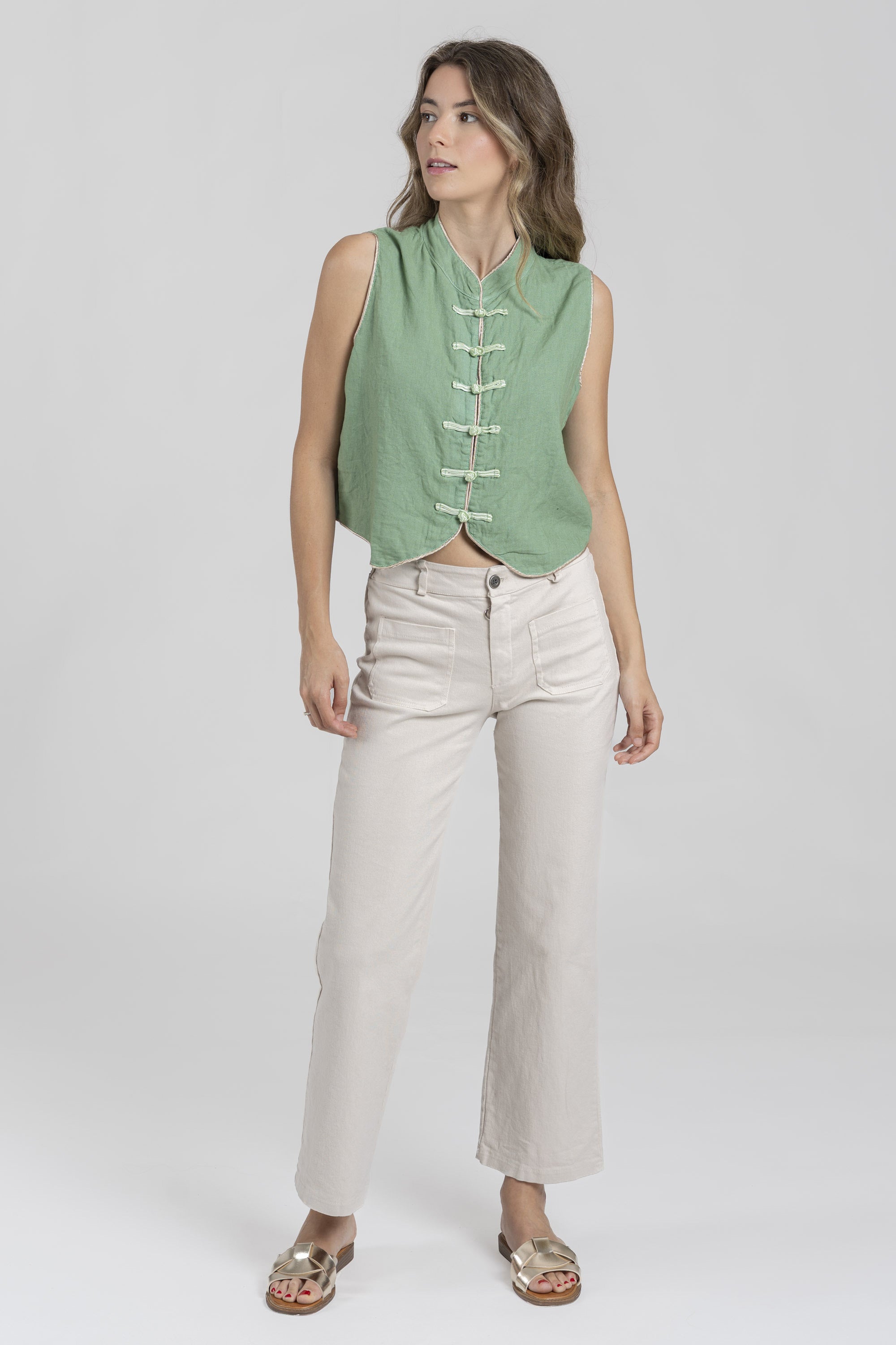 Tejido mezcla lino. Manga sisa. Cierre botones. Talla S. Altura modelo: 1.70 m