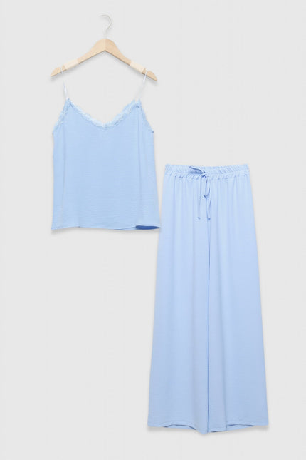 Top tejido de gasa. Tejido textura. Diseño fluido. Cuello pico. Manga tirantes. Detalles con encaje.
