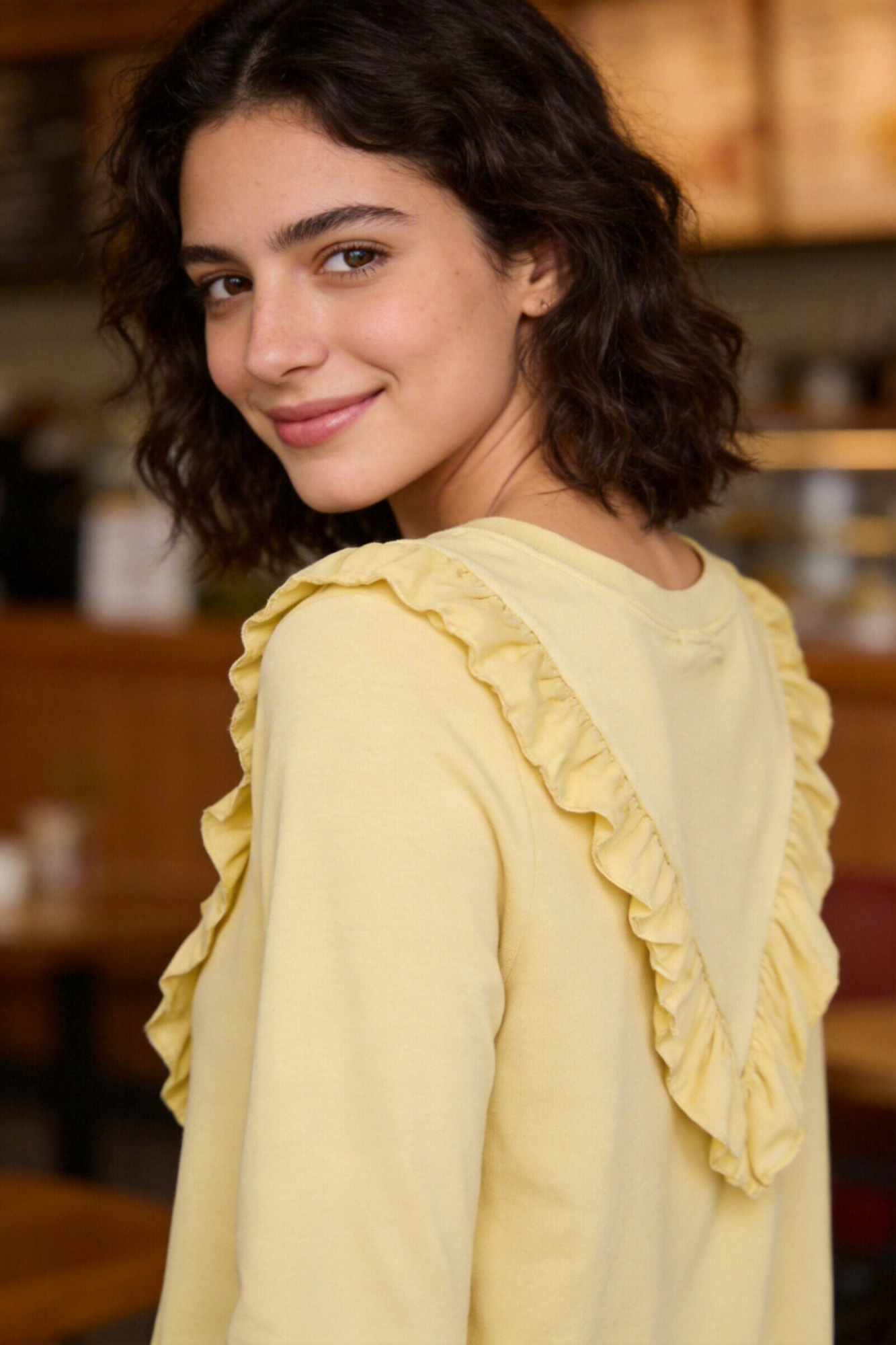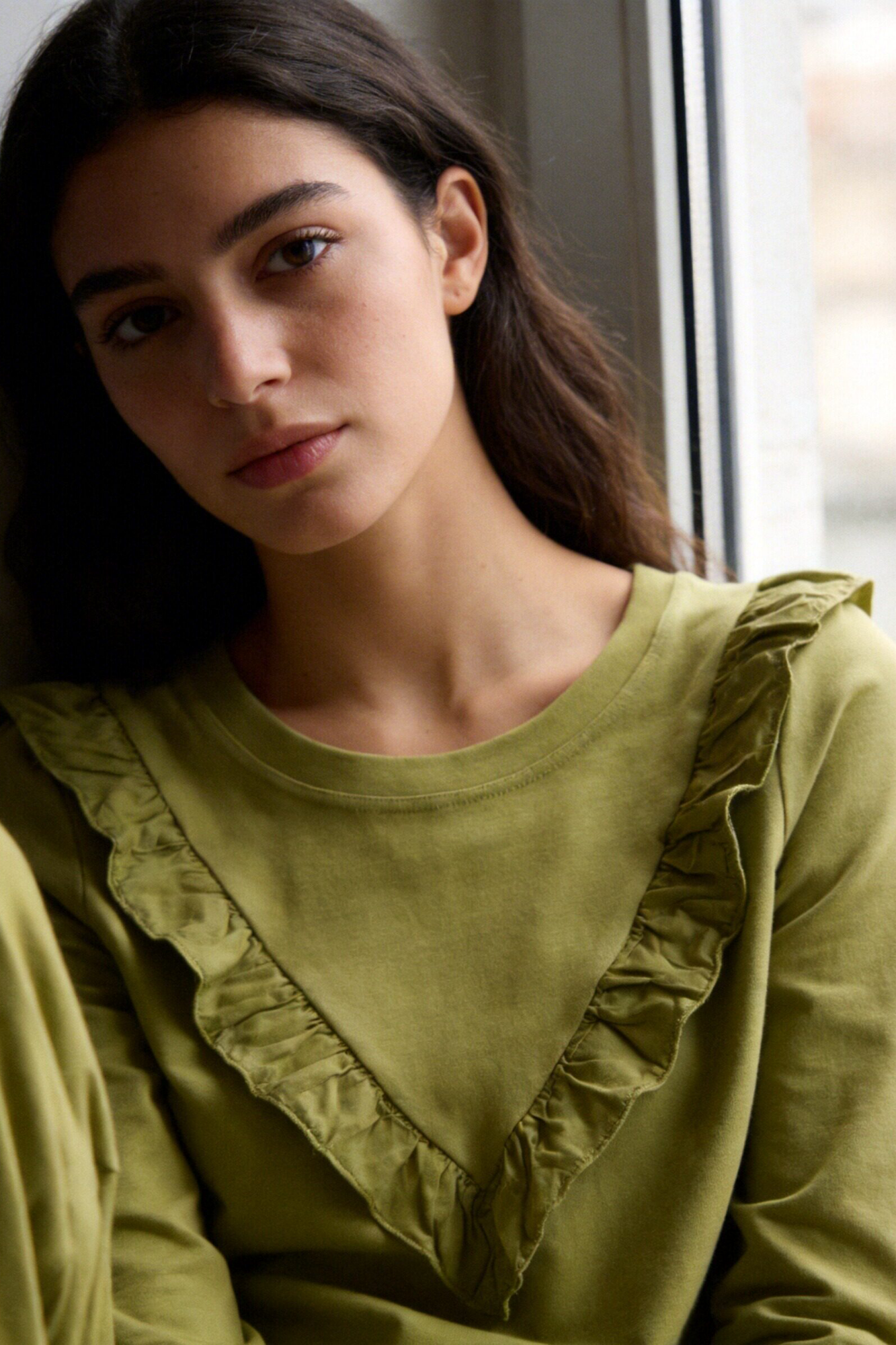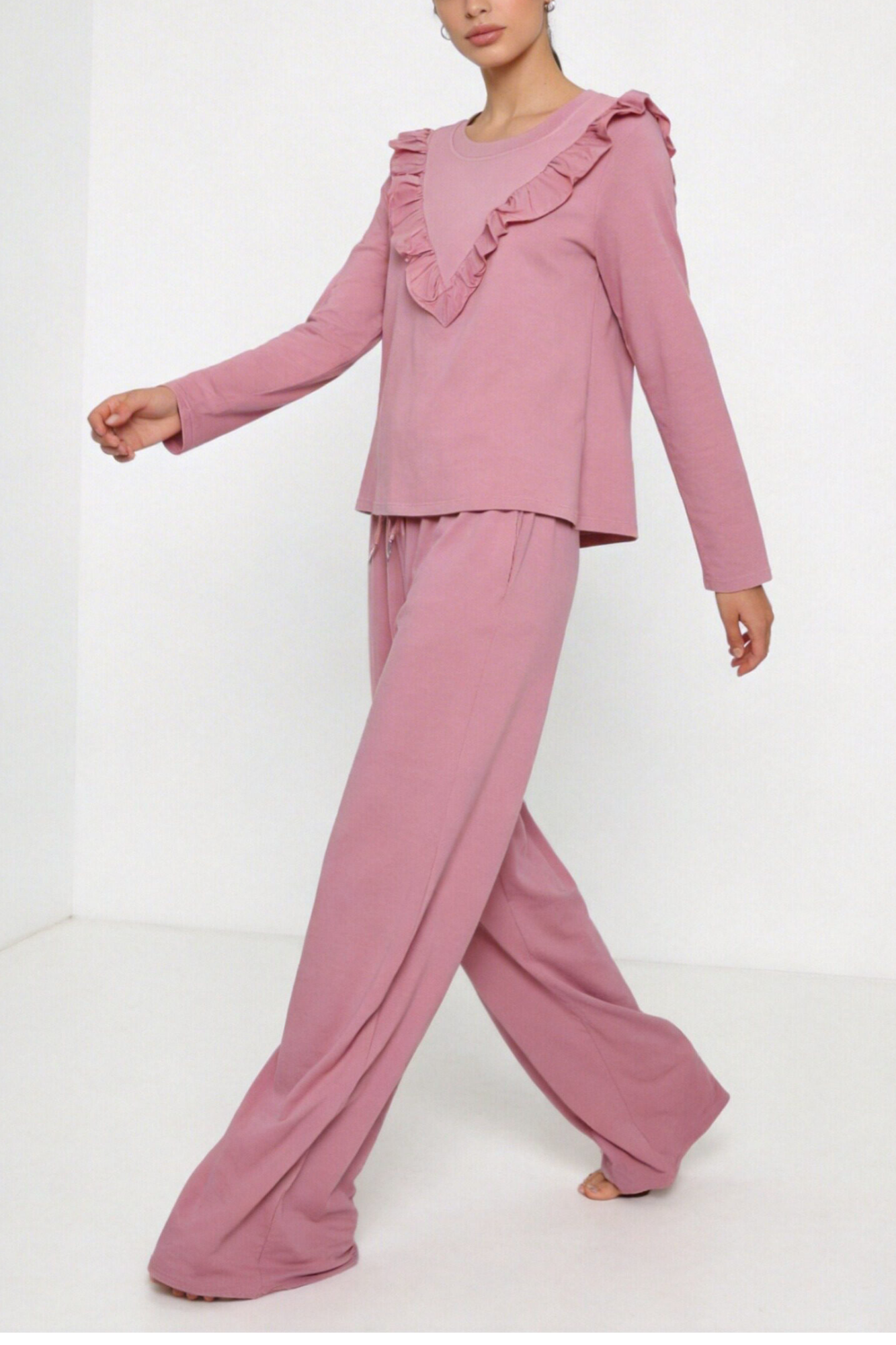 Conjunto de camiseta y pantalón. Tejido mezcla de algodón. Camiseta de cuello redondo y manga larga. Detalle de volantes. Pantalón de tiro alto. Cintura elástica ajustable con cordones. Pernera recta.