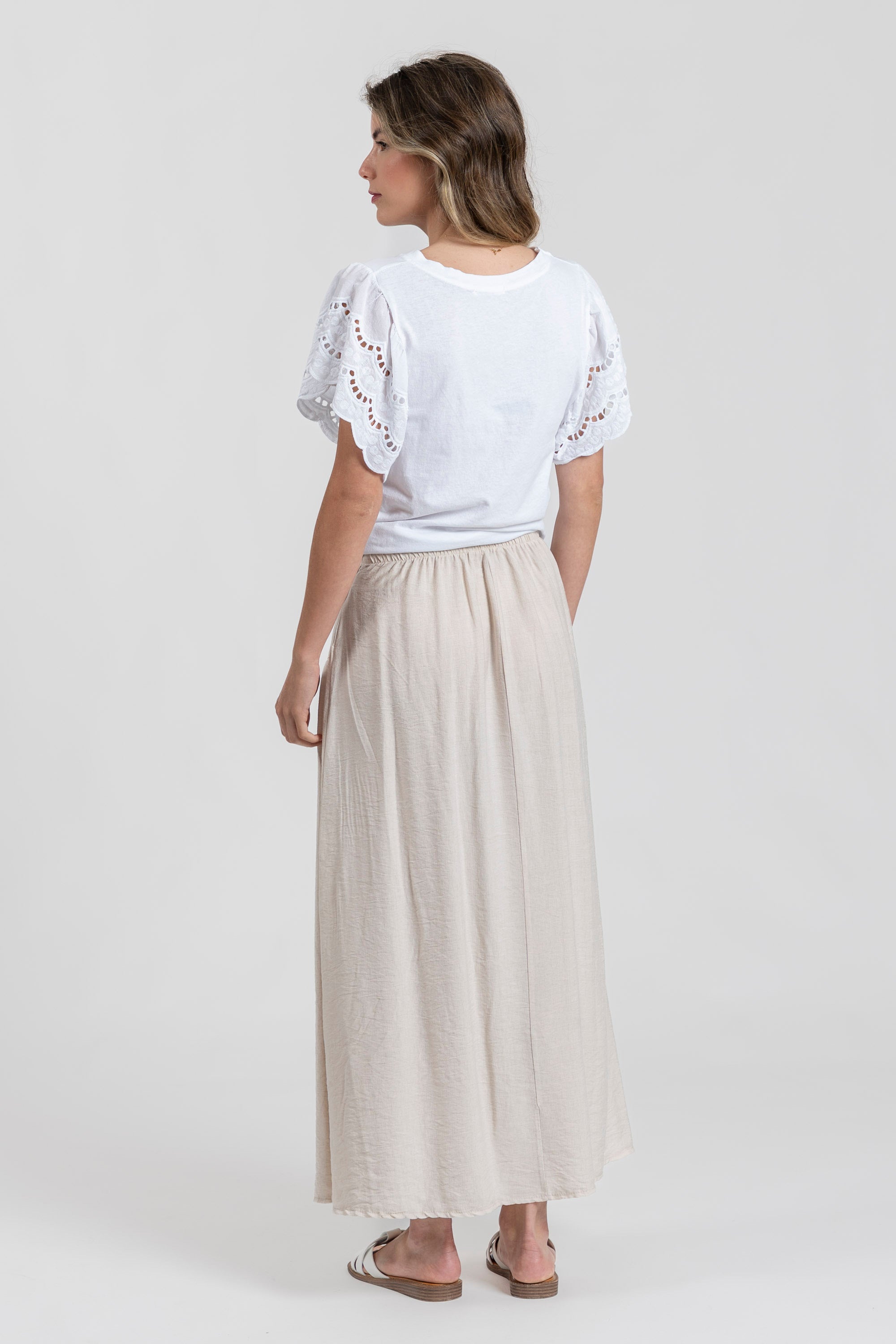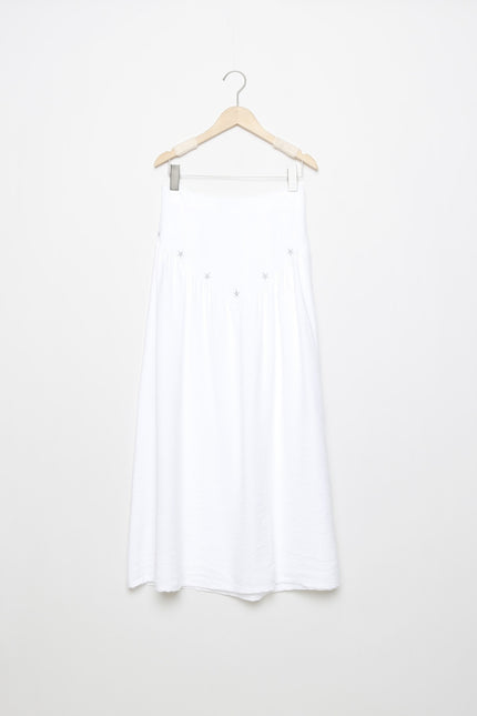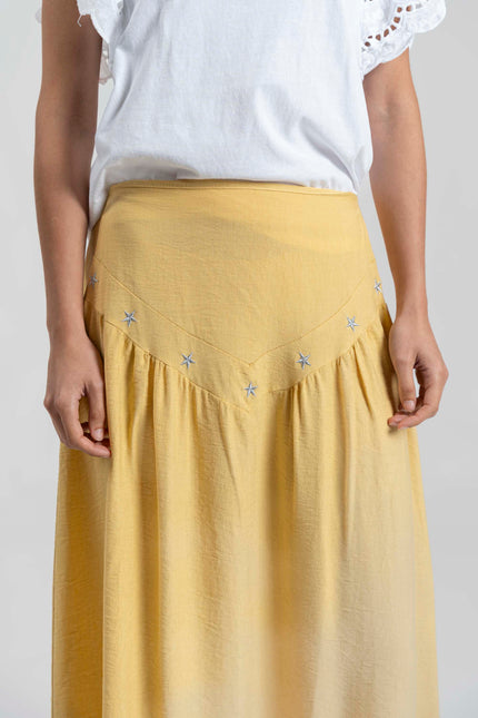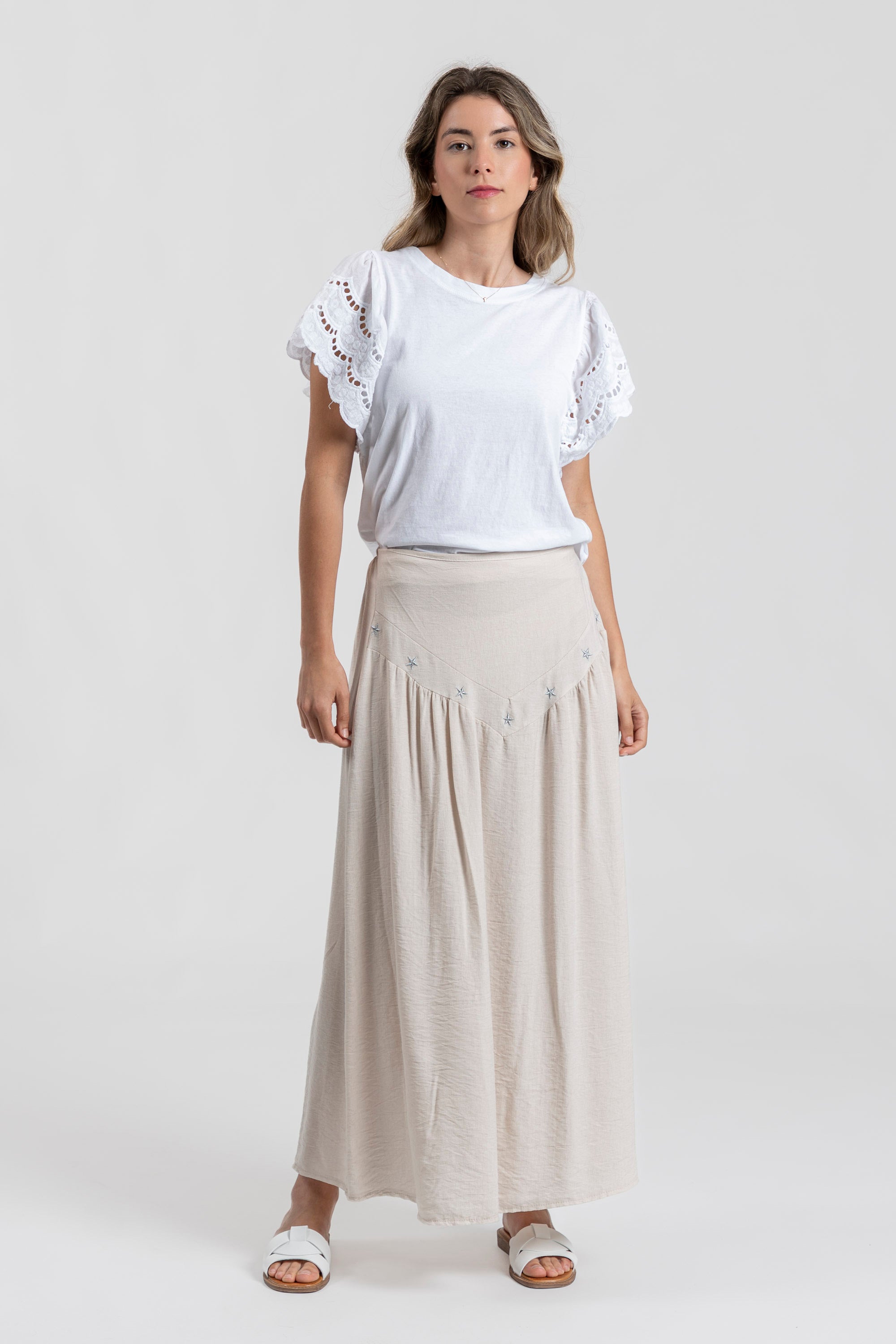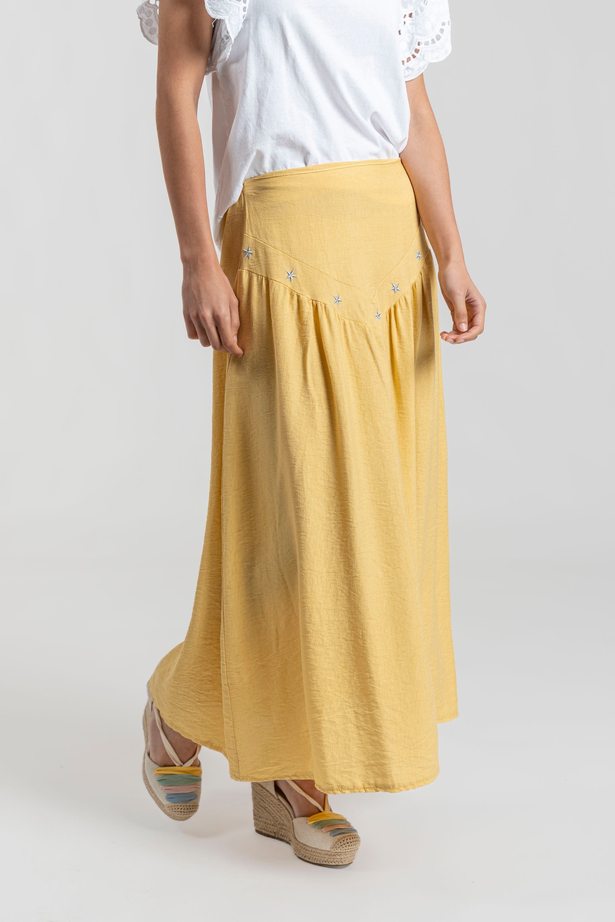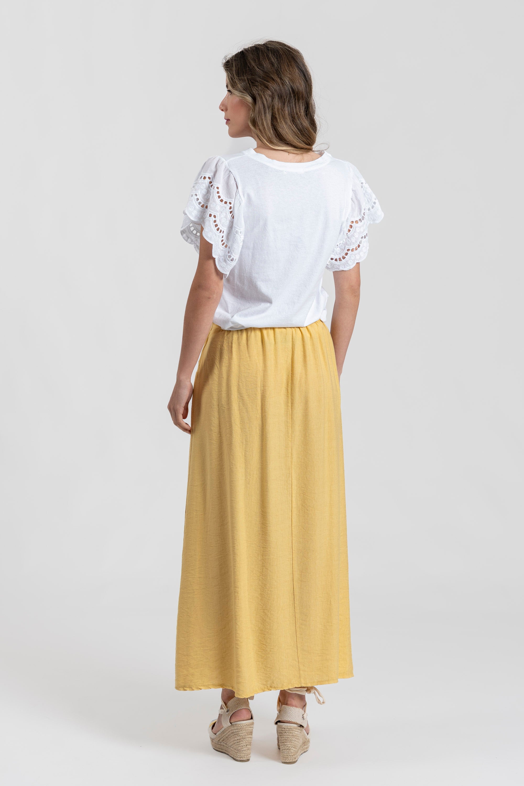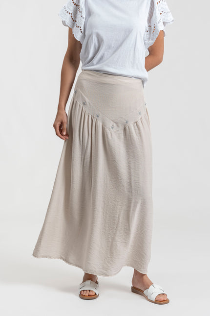 Tejido fluido. Diseño midi. Diseño vuelo. Diseño midi. Cintura elástica. Detalle bodados. Talla modelo: S.