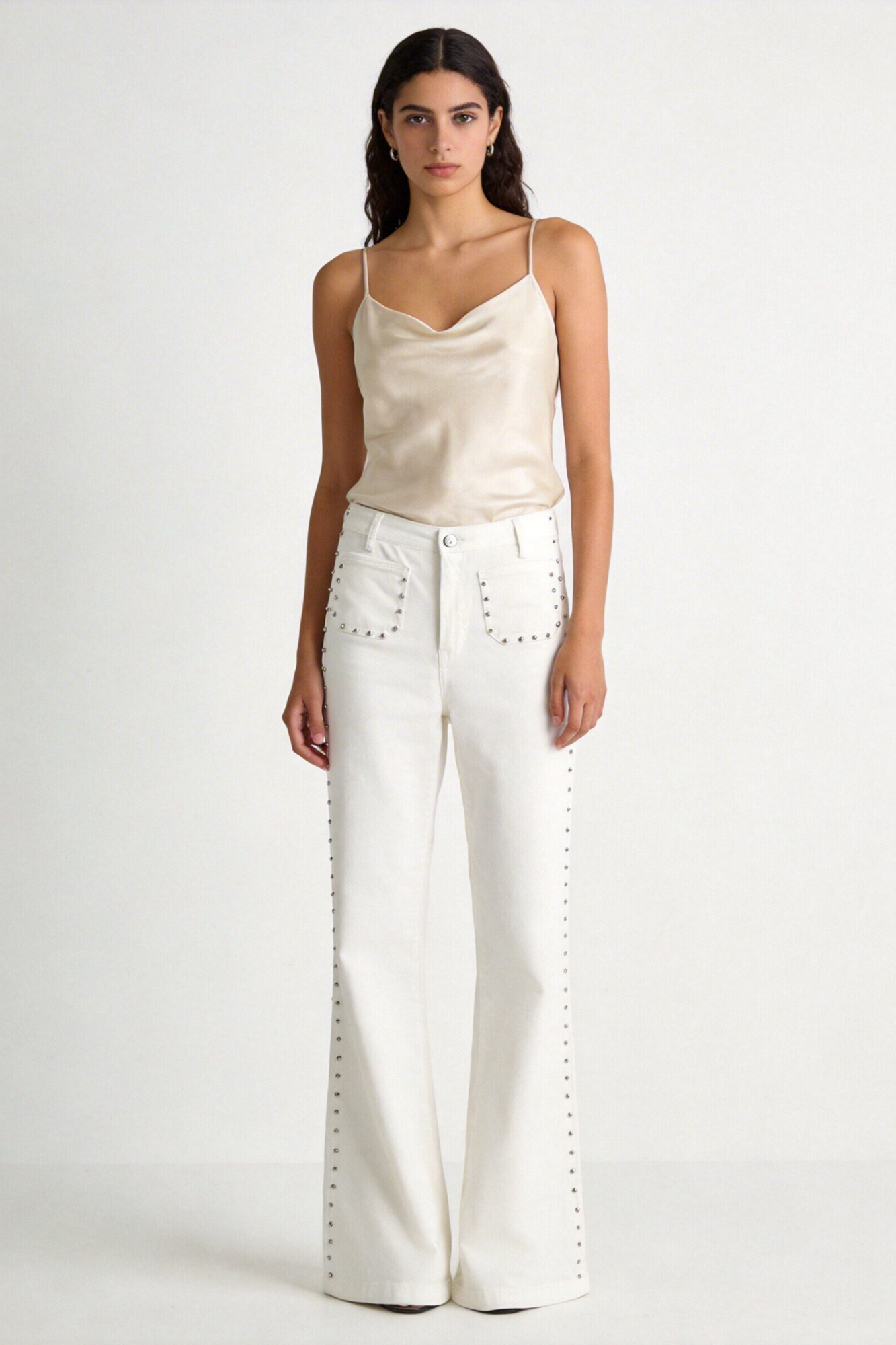 Tejido tejano. Tiro alto. Cuatro bolsillos. Detalle de tachuelas. Diseño flare.