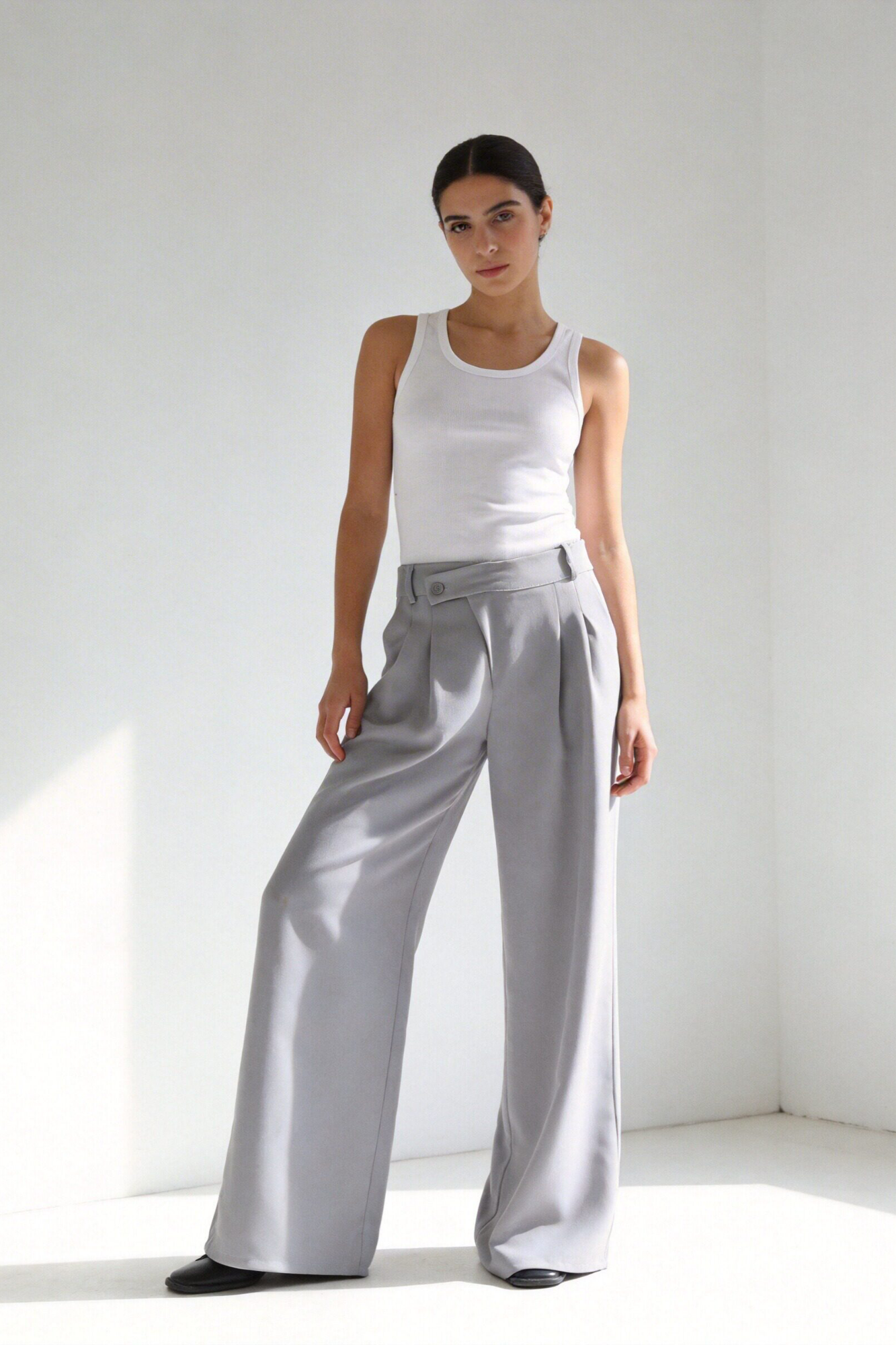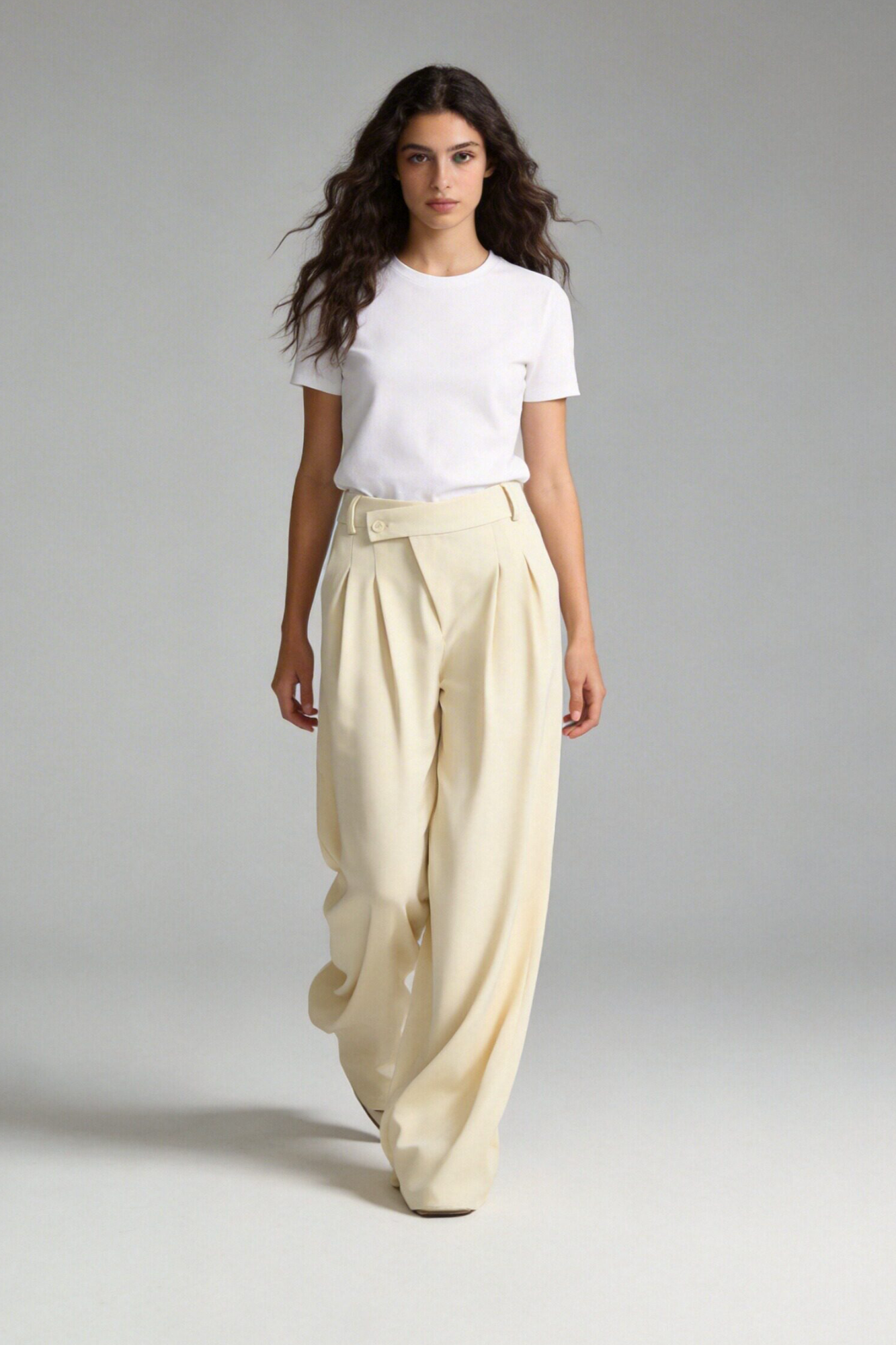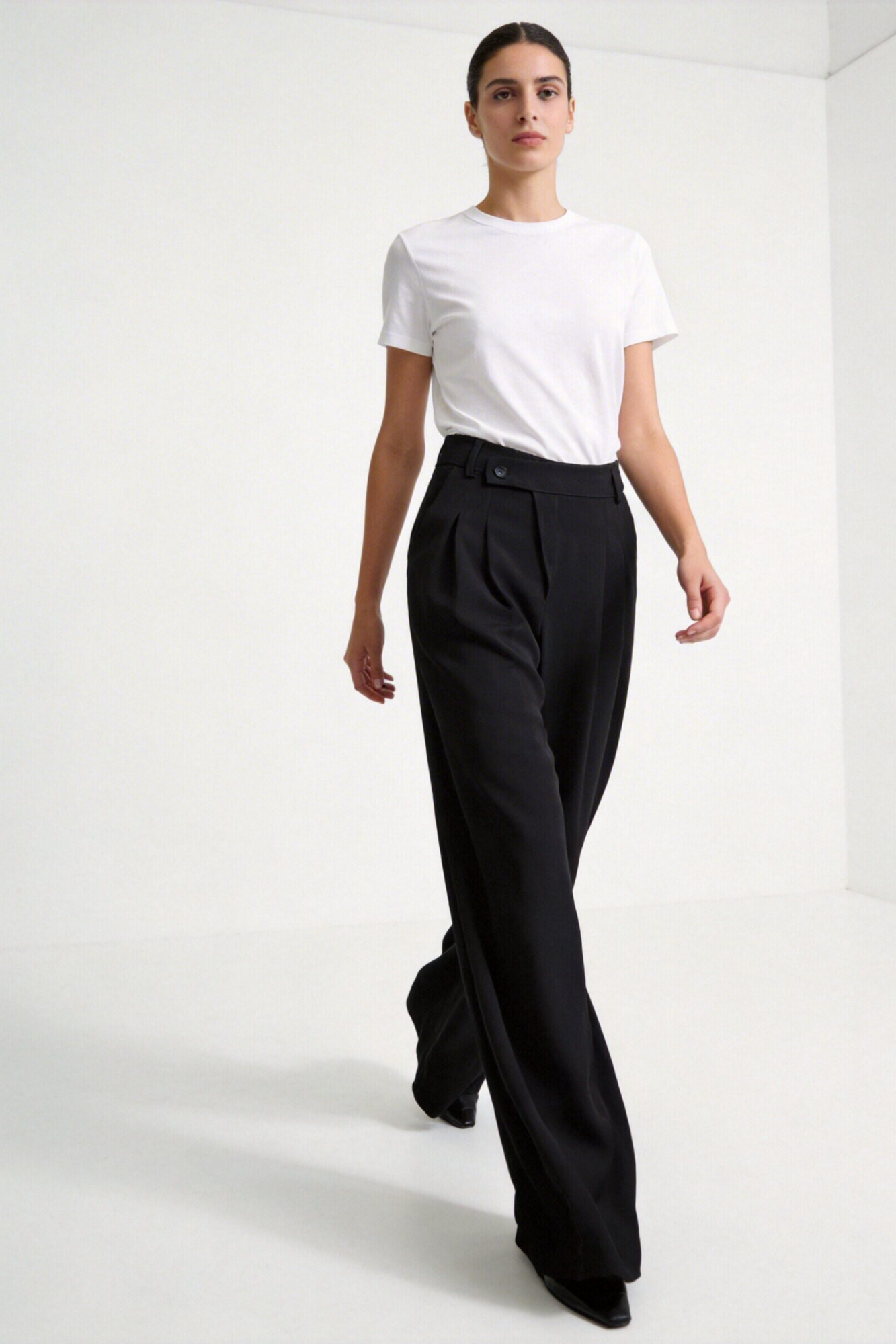 Tejido fluido. Tiro alto. Cintura elástica. Cierre con cremallera y botón. Detalla pliegues. Bolsillos laterales. Pernera ancha.