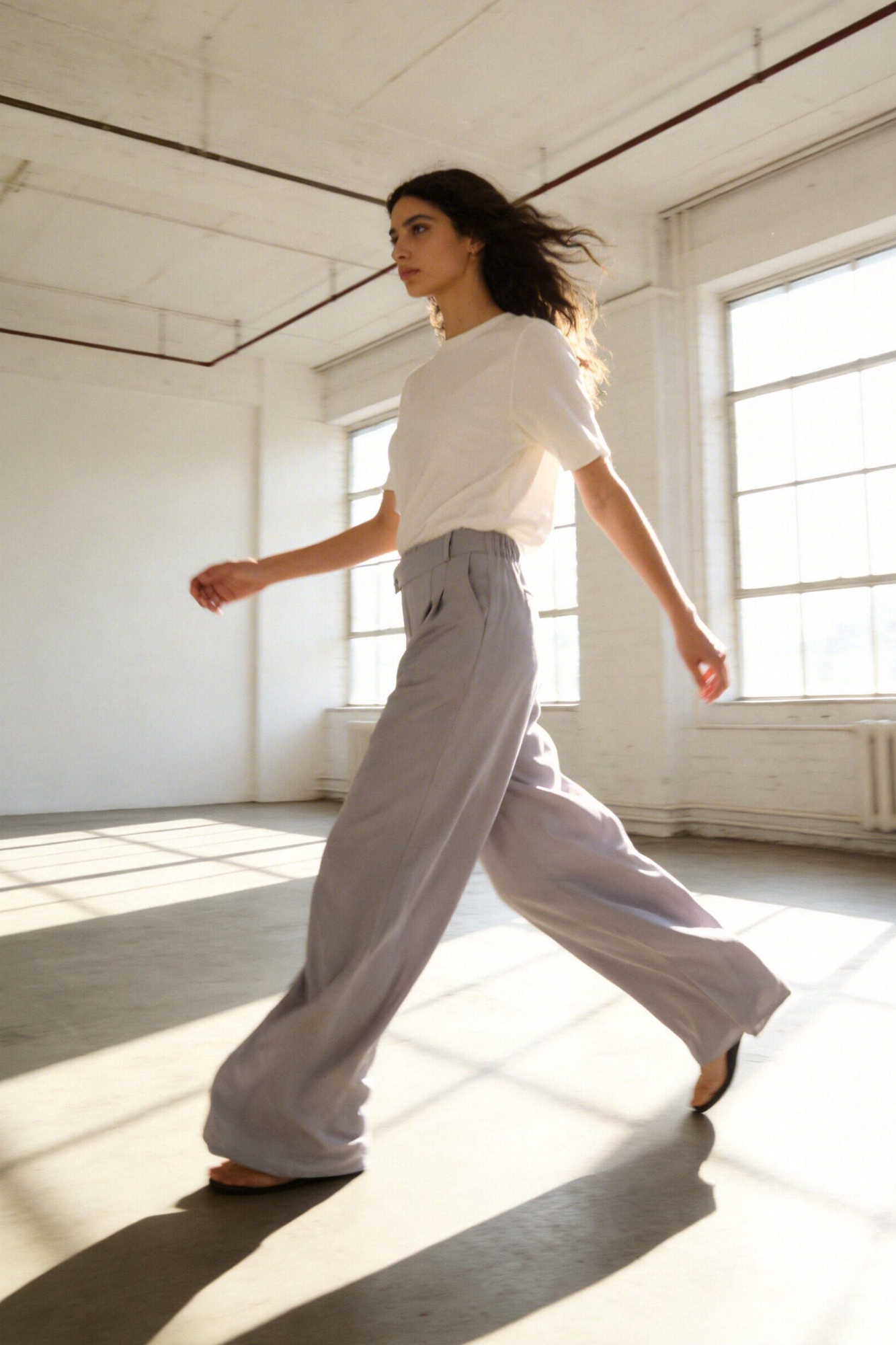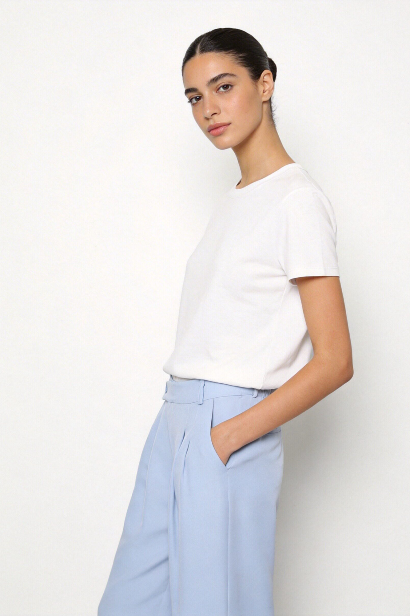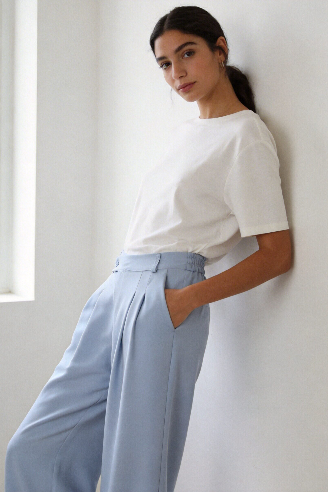 Tejido fluido. Tiro alto. Cintura elástica. Cierre con cremallera y botón. Detalla pliegues. Bolsillos laterales. Pernera ancha.