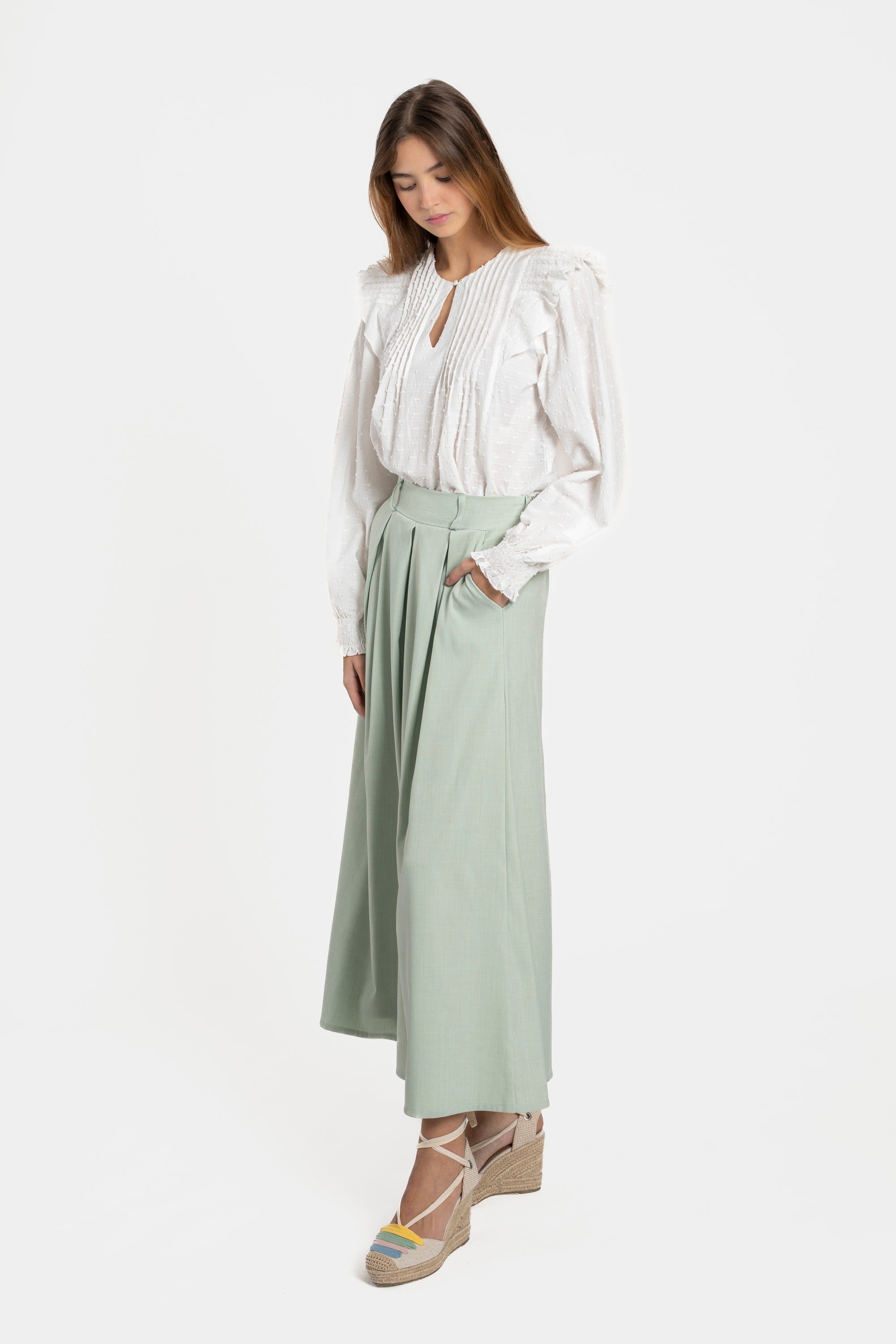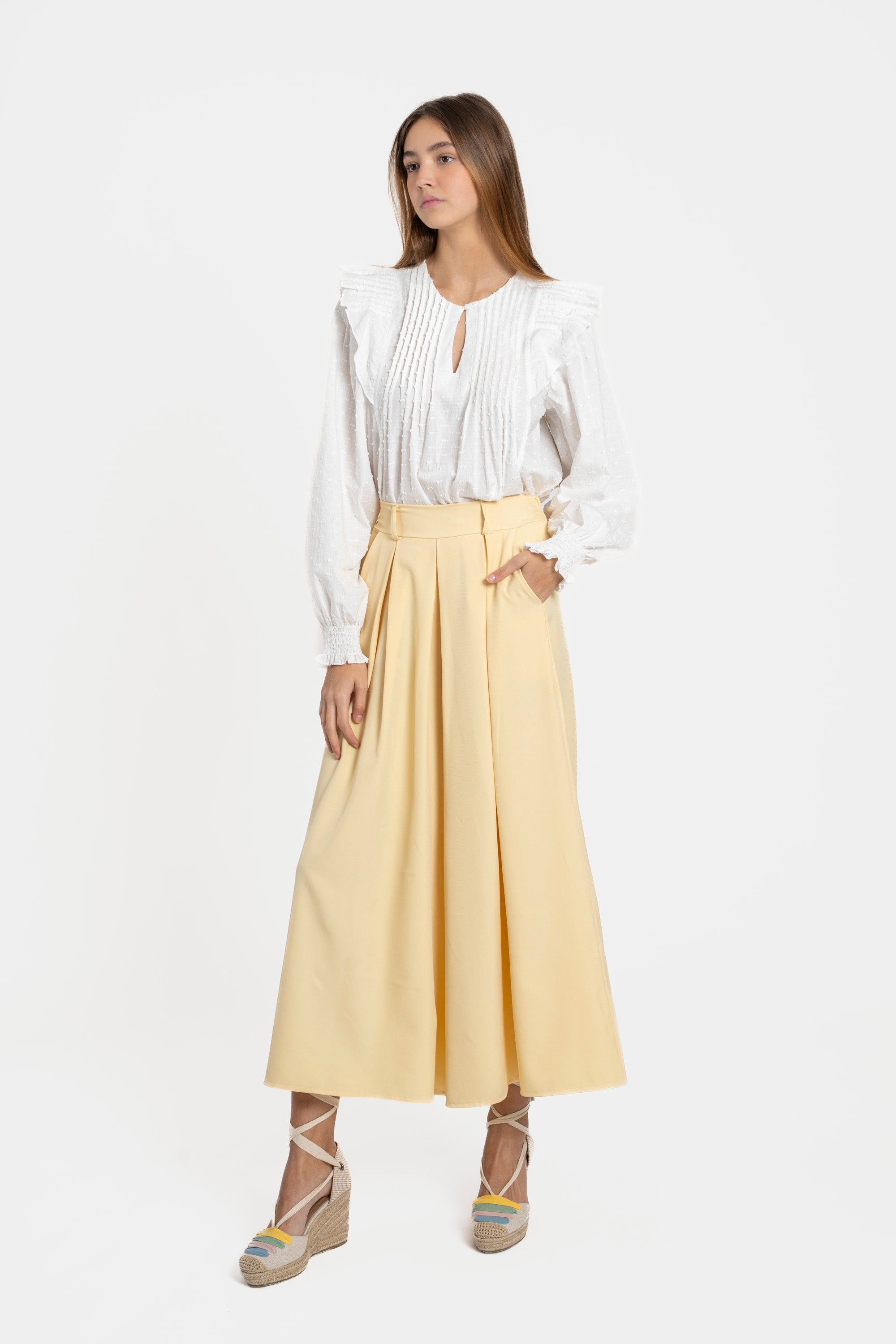 Pantalon de tiro alto. Super ancho. Bolsillos laterales. Diseño midi. CINTURÓN NO INCLUIDO.