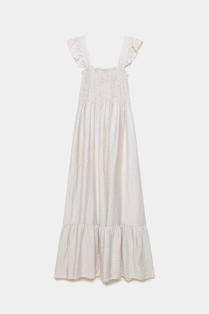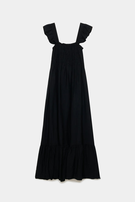 Tejido fluido. Diseño evasé. Diseño largo. Escote cuadrado.