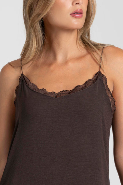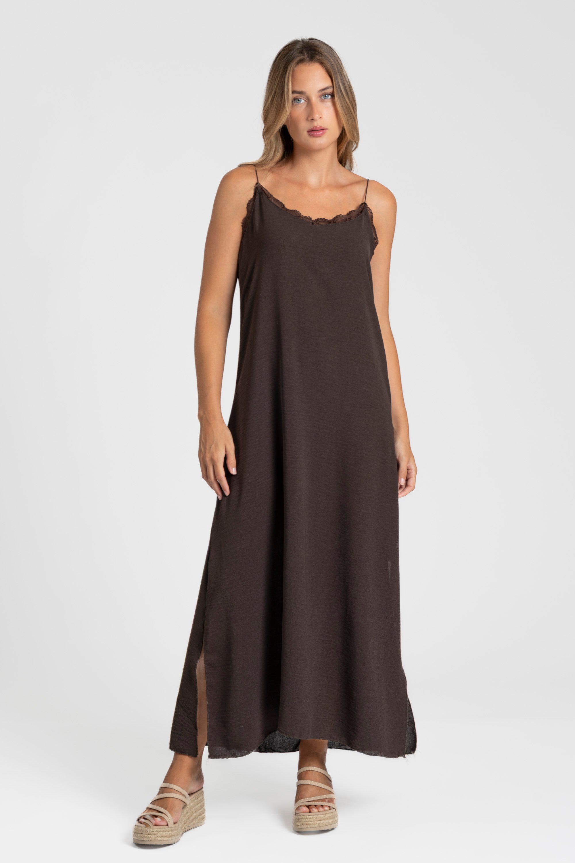 Tejido de gasa. Diseño recto. Diseño lencero. Diseño largo. Escote pico. Tirantes finos. Abertura en el bajo. Detalle encaje. Talla S. Altura modelo: 1.66 m