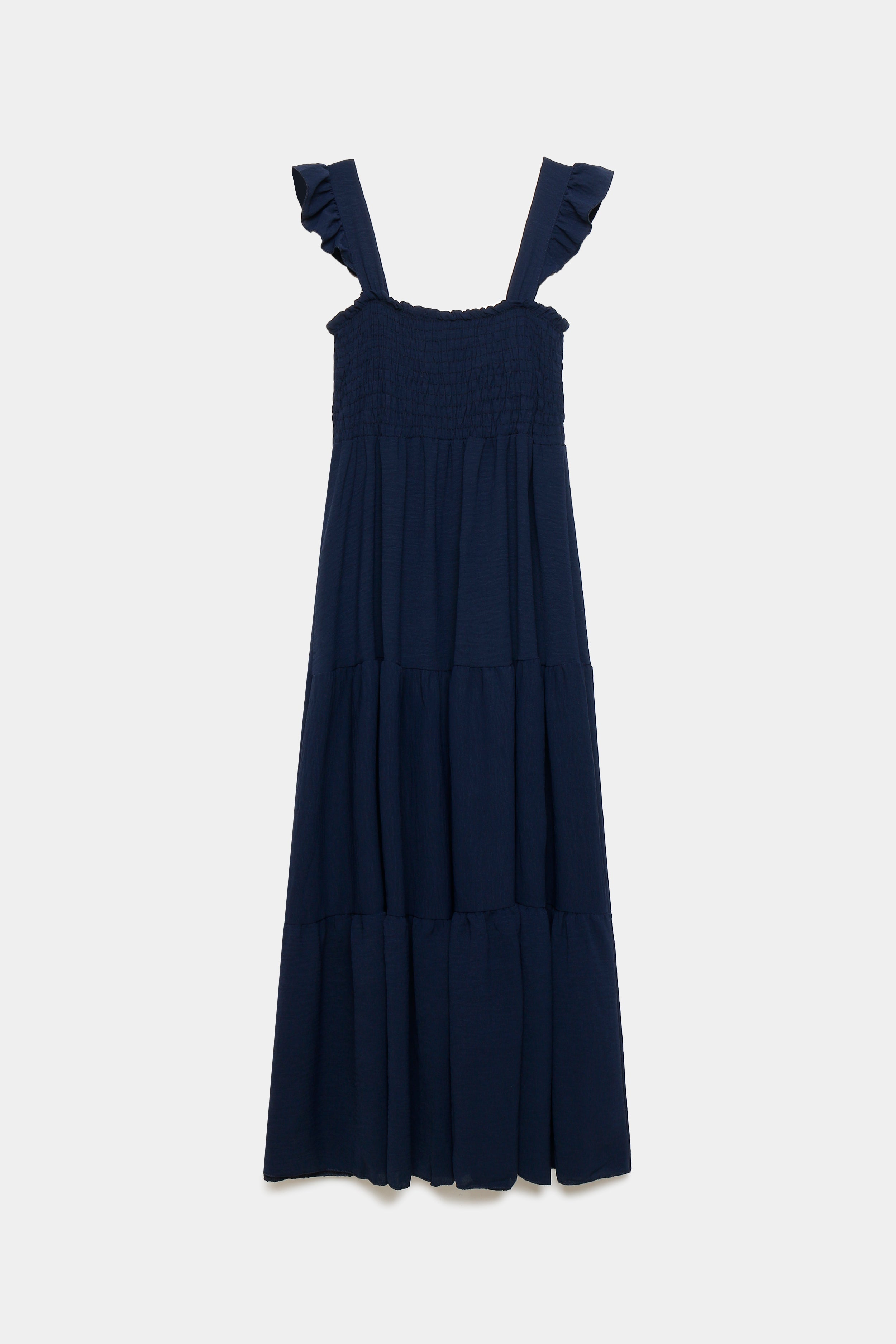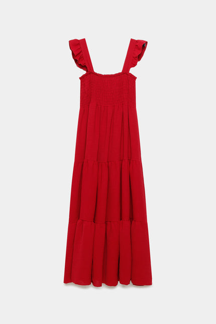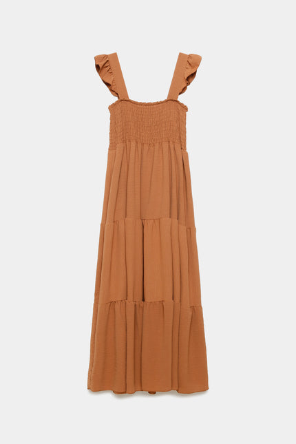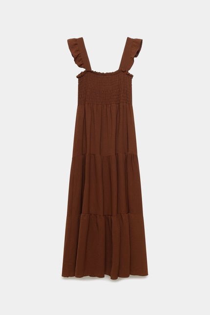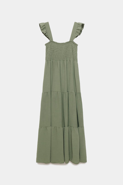 Tejido fluido. Diseño evasé. Diseño largo. Escote cuadrado.