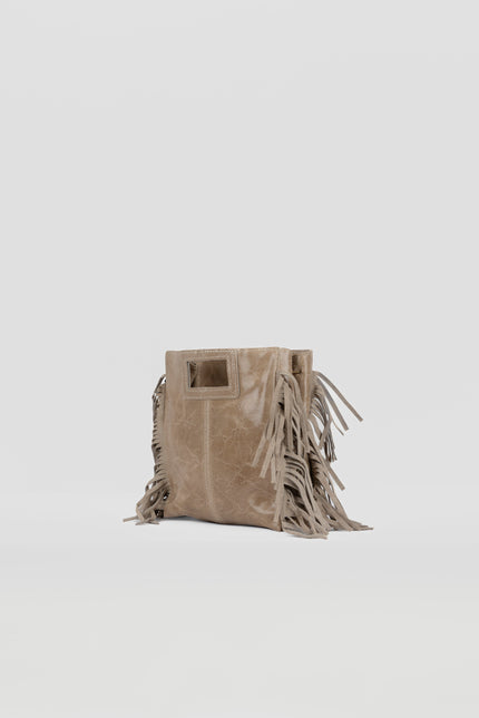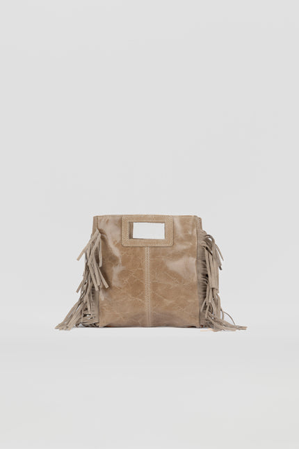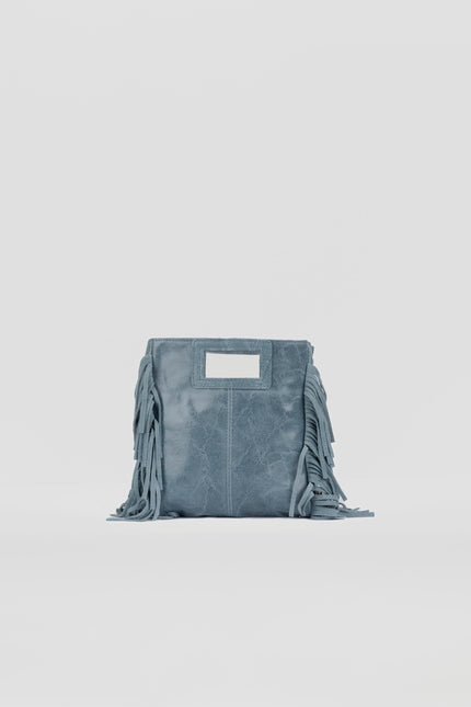 Tejido en piel. Diseño bandolera. Tamaño pequeño. Cierre de cremallera superior. Asa de mano. Asa larga extraíble. Bolsillo interior. Forrado. Flecos decorativos. Medidas: 14.0 x 17.0 X 4.0 cm. (largo x alto X ancho).