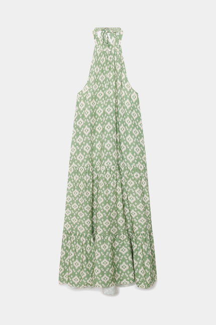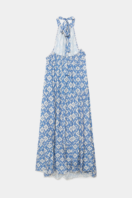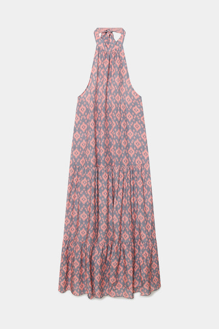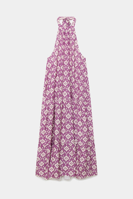 Tejido fluido. Diseño estampado. Diseño oversize. Diseño largo. Diseño evasé. Cuello halter. Bajo volante.